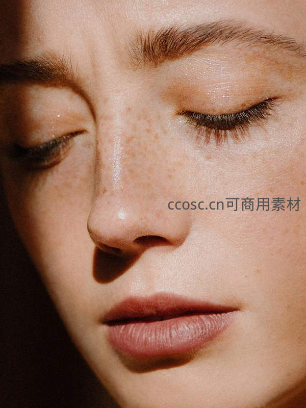 特写镜头捕捉闭眼女子面部细节,阳光洒落突显肌肤纹理与雀斑,光影对比营造出自然、真实且温柔的美感。