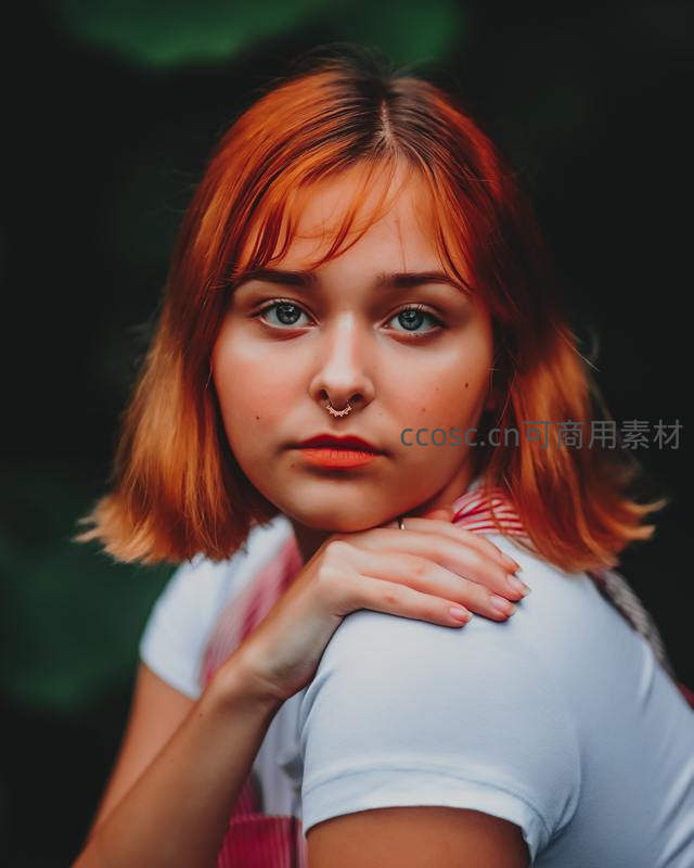 一位红发少女以手托肩,眼神略带忧郁地凝视镜头,鼻环与柔和妆容增添个性,背景虚化突出主体,传递青春期的静谧与思考。