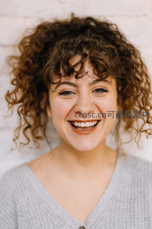卷发女孩对着镜头绽放灿烂笑容,唇钉与温暖笑容相得益彰,身穿灰色针织衫,背景为简洁白色砖墙,传递积极乐观的生活态度。