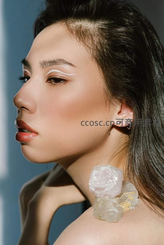 女性侧脸特写,妆容精致,白色眼线勾勒出独特美感,肩头放置天然水晶,光影交错间尽显柔美与艺术气息。