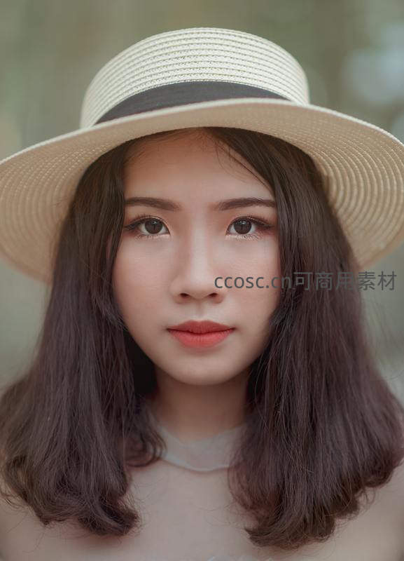 年轻女子戴宽檐草帽,背景虚化自然,眼神清澈柔和,整体氛围宁静舒适,充满夏日田园生活的悠闲与美好。