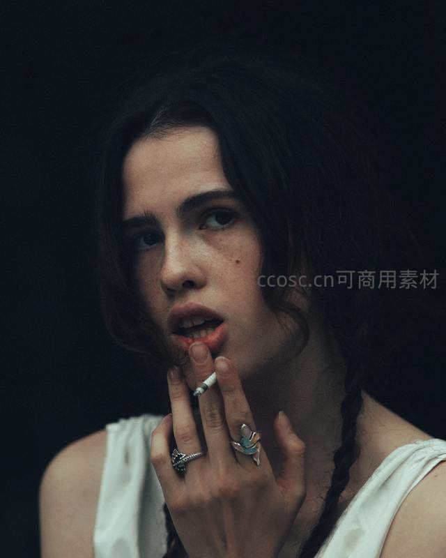 在昏暗背景下,女子手持香烟,佩戴夸张戒指,眼神迷离,散发出不羁与时尚交织的独特气质。