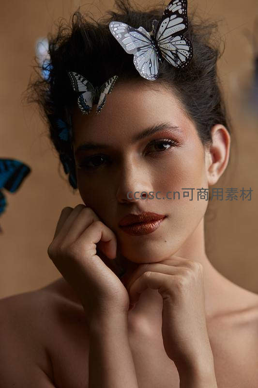 少女发间点缀着几只栩栩如生的蝴蝶,妆容温暖柔和,双手轻托下巴,营造出宁静梦幻的艺术氛围,充满诗意与浪漫。