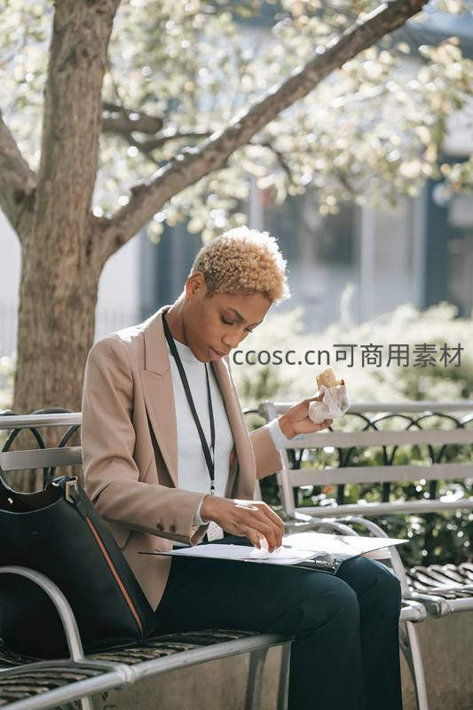 一位职业女性坐在公园长椅上,一边吃着三明治一边翻阅文件,展现了现代职场人兼顾工作与生活的状态。