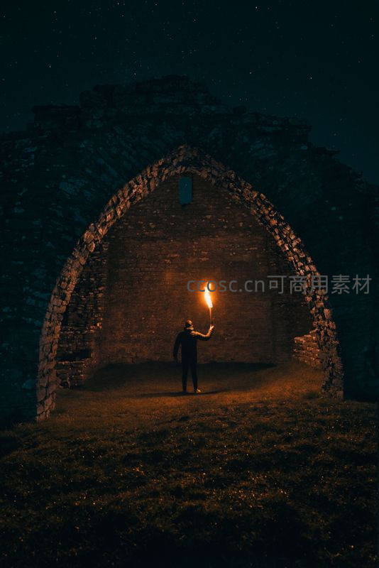 在古老石拱门内,一人手持燃烧的火把,暖光与头顶的点点繁星形成冷暖对比,营造出神秘而庄严的历史氛围。