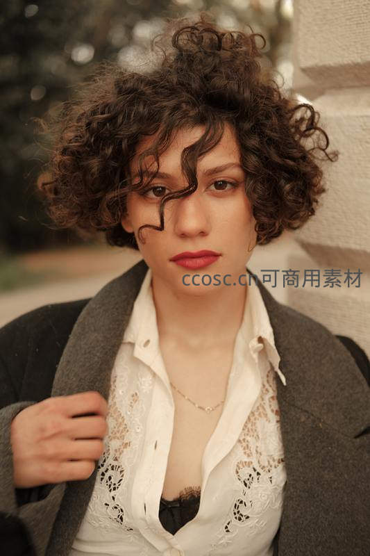 卷发女孩身穿灰色外套搭配白色蕾丝内搭,在户外自然光下直视镜头,神情自信从容,展现都市文艺青年的时尚态度。