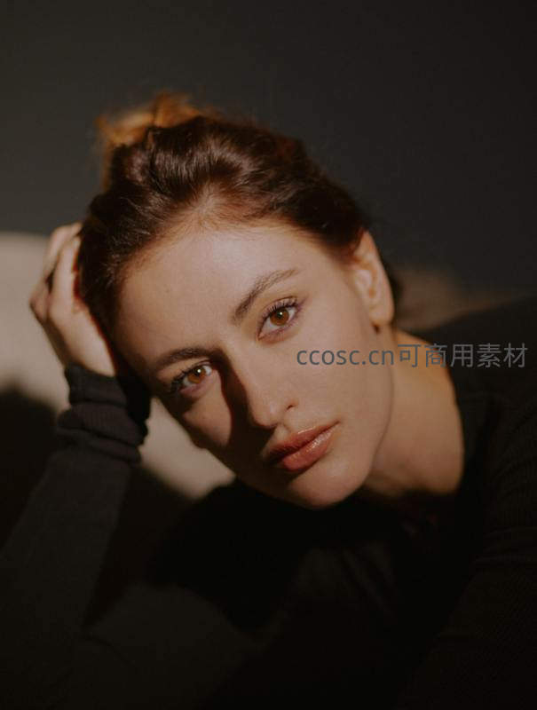 在明暗对比强烈的光线下,一位女性手托头部,眼神略带忧郁地凝视前方,营造出一种安静、内省的氛围。