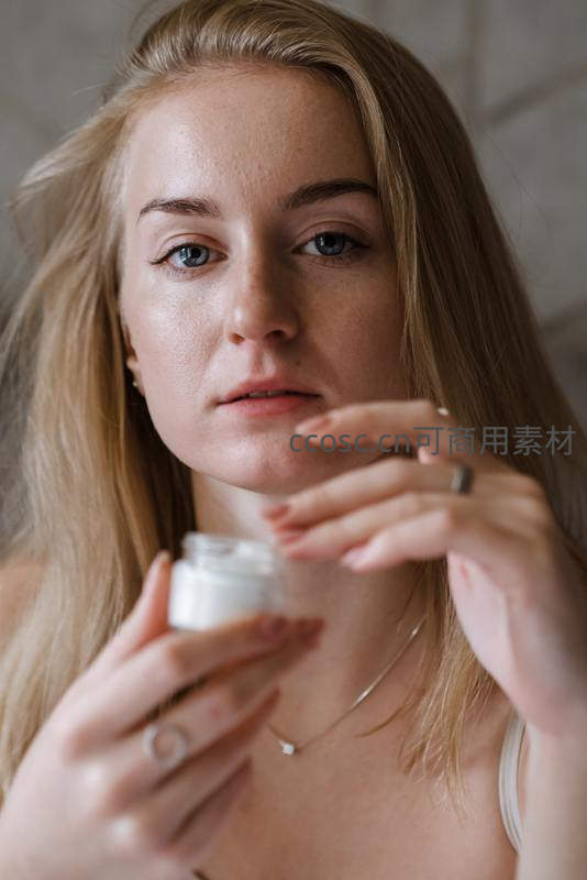 一位金发女性正在用指尖轻柔地将白色面霜涂抹于脸颊,展现日常护肤的细腻瞬间,背景柔和,充满生活气息。