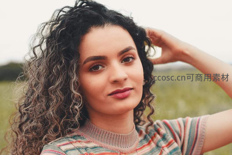 卷发少女置身绿野之中,手抚秀发浅笑盈盈,阳光洒落尽显青春活力与自然清新的田园风情。