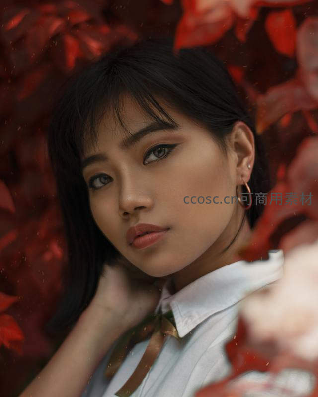 黑发女性身着白色衬衫,佩戴金色耳环,在绚烂红色秋叶的映衬下回眸凝望,妆容精致,光影柔和,营造出静谧而唯美的视觉效果。