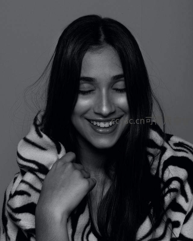 黑白色调下,长发女子裹着虎纹披肩,闭眼微笑露出洁白牙齿,神情放松愉悦,简洁背景突显情感表达,传递纯粹的快乐与温暖。