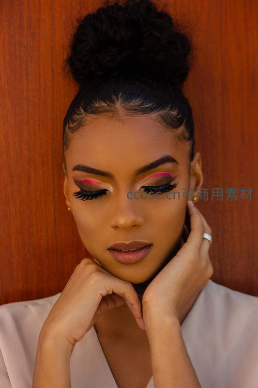 黑发女子以高盘发造型搭配鲜艳粉色眼妆,双手轻托下巴,姿态优雅,展现现代美妆艺术与个人魅力。