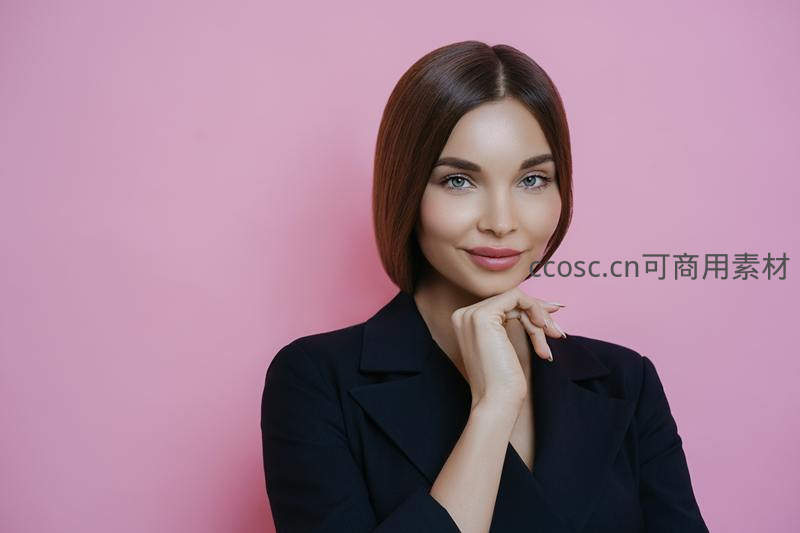 身穿黑色西装的女性在纯粉色背景下微笑凝视镜头,手托下巴,展现出专业、自信且亲和的职场形象。