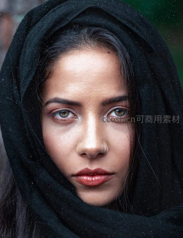 一位戴着黑色头巾的女性,眼神深邃而专注,鼻翼上的小环增添一丝个性,整体氛围神秘而富有故事感。