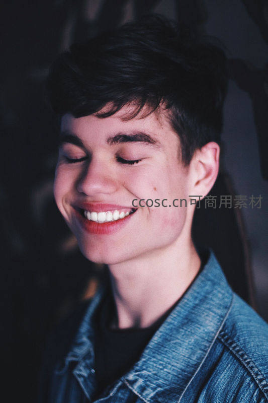少年闭目微笑,露出洁白牙齿,身穿蓝色牛仔外套,在柔和光线下散发出轻松自在、充满感染力的青春气息。