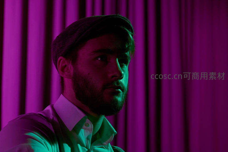 在紫绿交织的霓虹灯光下,一位戴帽男子侧脸凝望远方,营造出神秘而富有艺术感的视觉氛围。