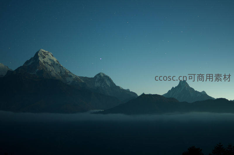 巍峨的雪山峰顶在夜色中静默矗立,脚下云海翻腾如仙境,头顶星空清澈明亮,整个画面散发着一种庄严、纯净与超凡脱俗的美感。