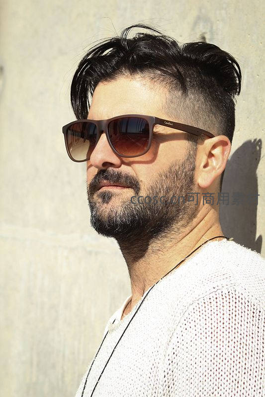 一位蓄着浓密胡须的男士佩戴棕色墨镜,身穿白色针织衫,在阳光下展现自信从容的侧脸轮廓,背景为简约墙面。