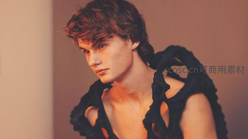 一位拥有蓬松卷发的青年男性,身穿设计独特的黑色镂空上衣,在柔和暖光下侧脸凝视,展现出沉静而富有艺术气息的时尚魅力。