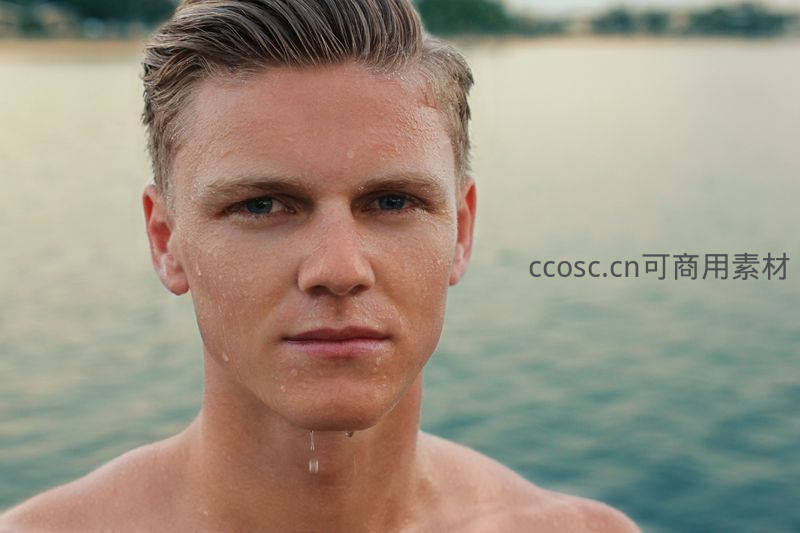 一位刚从水中出来的青年男性,头发湿漉漉紧贴额头,脸上挂着晶莹水珠,正直视镜头,背景是平静的湖面,尽显夏日清爽与自然活力。