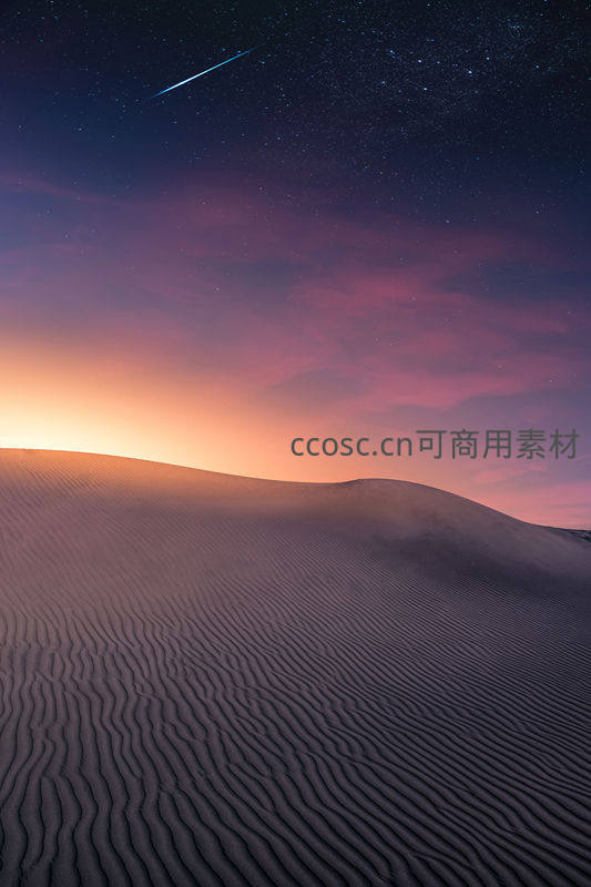 流沙起伏如波浪,紫粉晚霞与深蓝星河交融,一颗流星划破天际,为荒漠之夜增添神秘而浪漫的色彩。