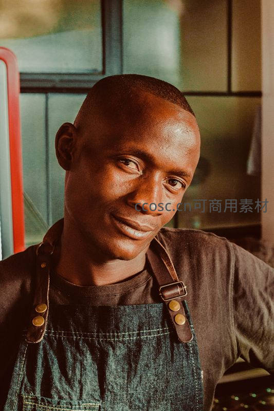 一位穿着牛仔围裙的非洲裔工匠面带温和微笑,目光友善地望向镜头。柔和的室内光线映照着他黝黑的皮肤,展现出劳动者朴实而自信的风采。
