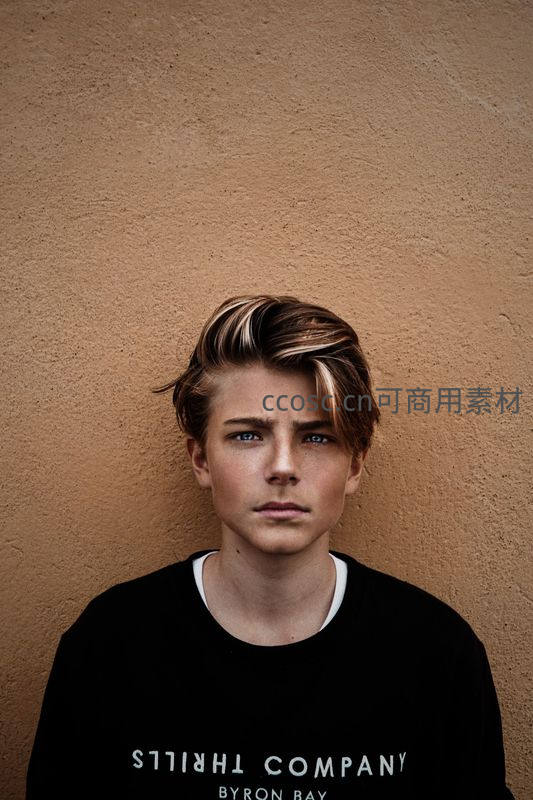 一位年轻男孩身着黑色印花T恤,倚靠在米色纹理墙前,眼神清澈而坚定,展现出青春期特有的沉静与自信。