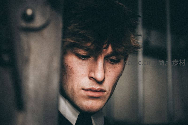 男子透过金属缝隙低眉沉思,氛围压抑神秘