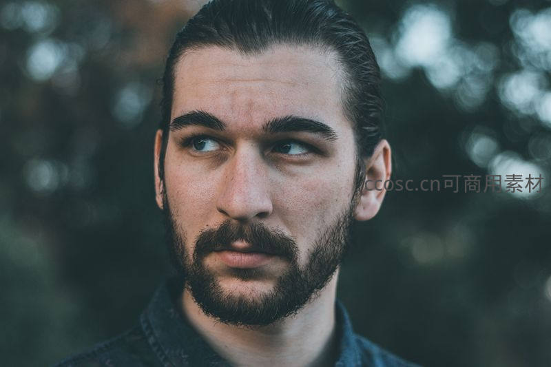 一位留着浓密胡须的年轻男子在户外自然光下凝视远方,神情专注而深邃,背景虚化突出主体。