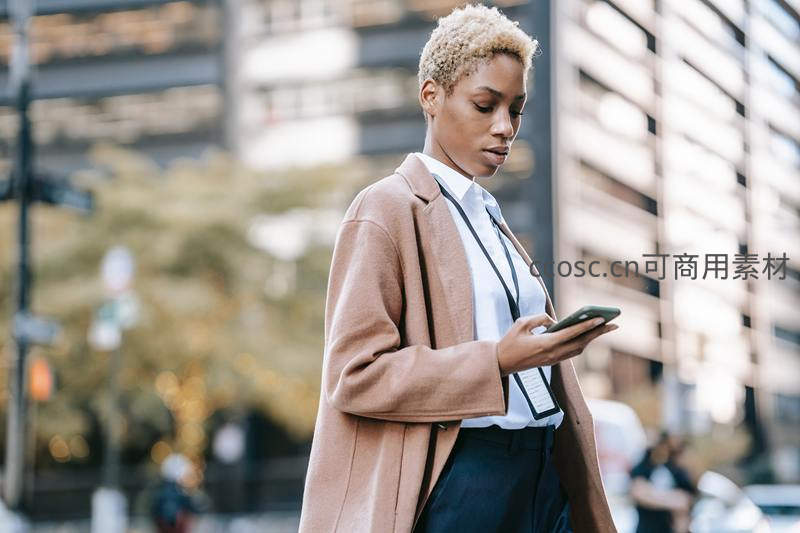 街头专注看手机的女白领