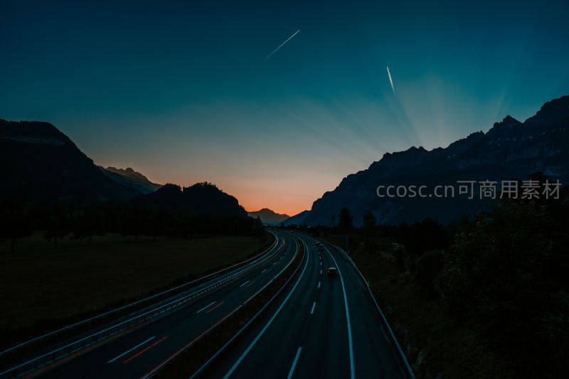 蜿蜒公路穿行于幽暗山谷,车灯拖曳出绚丽光轨,远处山峦剪影与渐变暮色相映,展现动静结合的夜间美景。