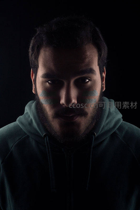 在深黑色背景中,一位蓄着胡须的男子面颊带有彩色条纹彩绘,眼神锐利,营造出强烈戏剧感与神秘气息。