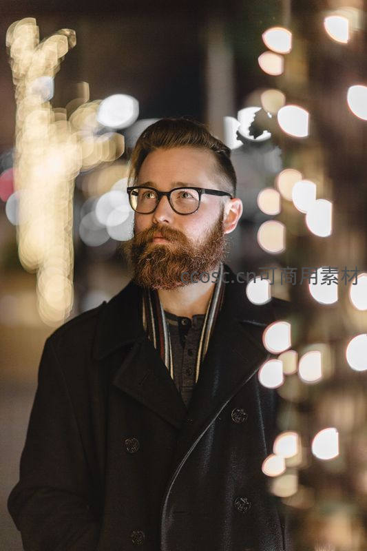 一名戴眼镜、留浓密胡须的男子站在灯光闪烁的城市夜景前,背景虚化成温暖光斑,传递出冬日节庆或街头漫步的温馨感。