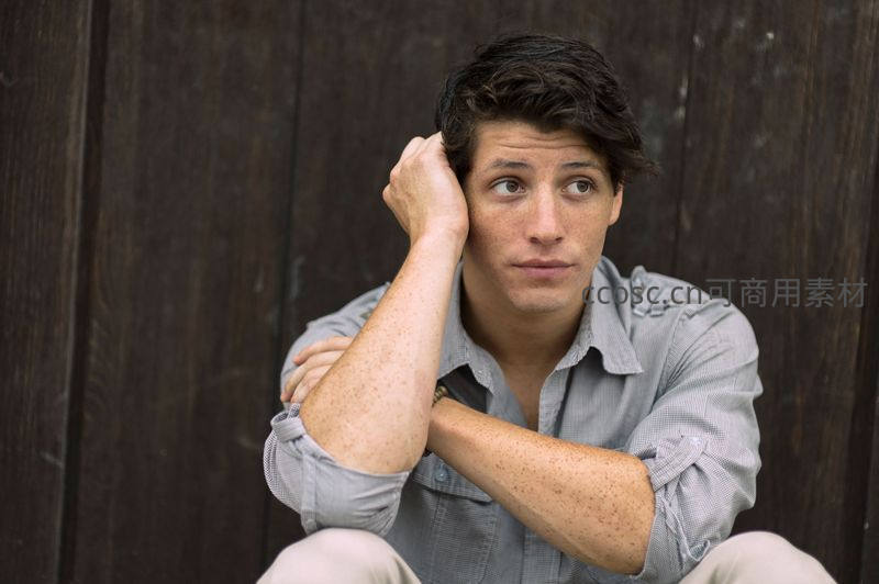 一位脸上有雀斑的青年坐在木质背景前,手托脸颊,目光望向一侧,表情若有所思,传达出安静内省的情绪状态。