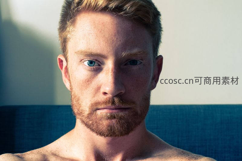一位拥有蓝色眼眸和红棕色胡须的男子赤裸上身,在柔和阳光下直视镜头,背景是深蓝色沙发,神情专注而富有故事感。
