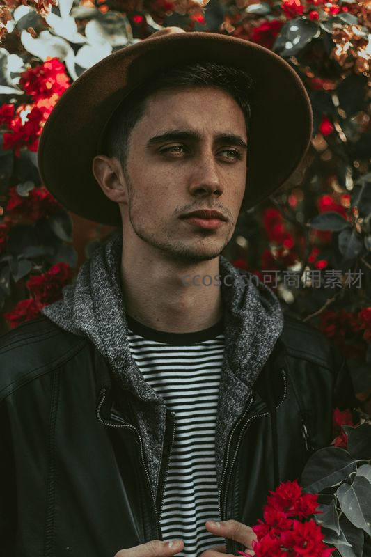 一位戴着棕色宽檐帽的青年站在盛开的红色花丛前,身穿黑白条纹衫与黑色皮夹克,眼神略带忧郁,营造出浪漫文艺氛围。