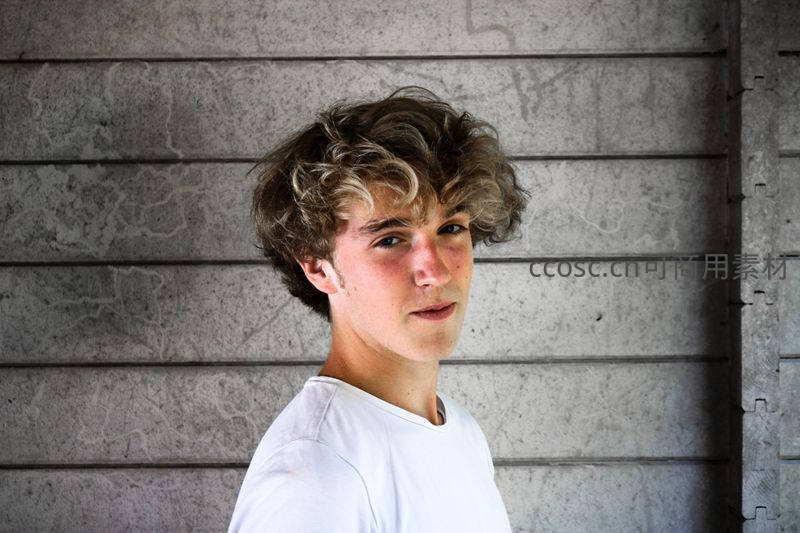 金棕色卷发少年身穿白色T恤,背靠灰色水泥墙,侧身回眸直视镜头,眼神清澈专注,背景纹理简洁,整体风格清新自然。