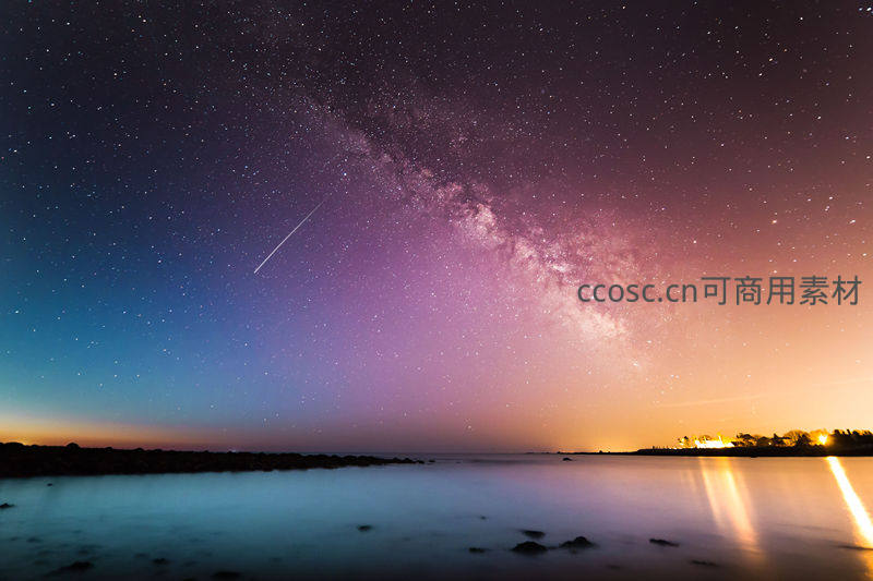 浩瀚银河如拱桥般横跨天际,紫色星云与蓝色夜空交织,湖面平静如镜,倒映着星光与远处温暖的灯火。