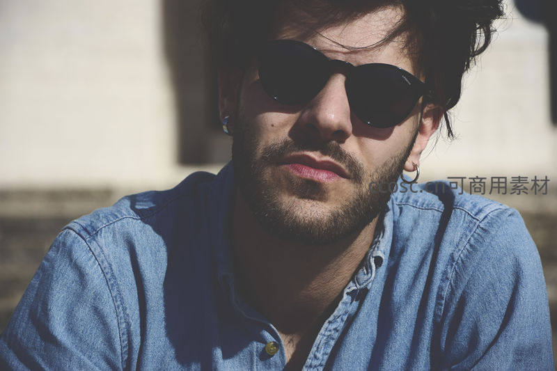 一位留着胡须、佩戴黑色墨镜的年轻男子,身穿蓝色牛仔衬衫,在户外阳光下微微侧头,展现出随性不羁的街头时尚风格与酷感气质。