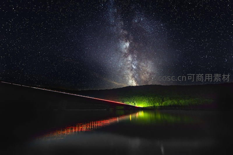 璀璨银河高悬夜空,桥上车灯拉出红色光带,湖面倒映星河与霓虹,绿树点缀岸边,营造出奇幻而宁静的夜景。
