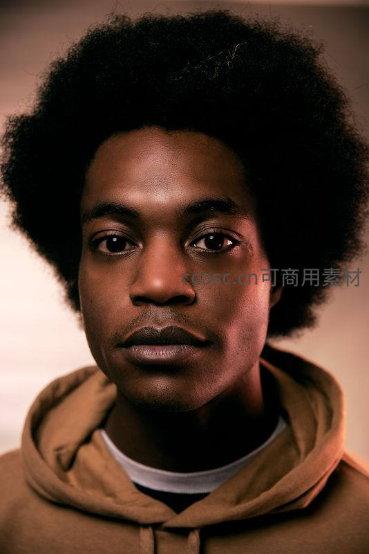 暖色调灯光下,黑人青年蓬松卷发与沉静眼神形成强烈视觉冲击,凸显个性魅力与内心力量。