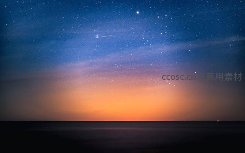 深邃的夜空中繁星点点,一道流星划破天际,海面平静如镜,橙色晚霞与蓝色星空交融,营造出梦幻而宁静的氛围。