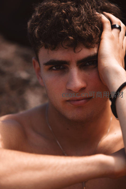 在明媚阳光下,一位健硕的卷发青年轻抚额头,佩戴简约项链,展现出健康活力与自然随性的夏日魅力。