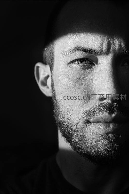 高对比度黑白照片捕捉男性侧脸,一束光打在眉骨与鼻梁,阴影勾勒出轮廓,眼神深邃,充满戏剧张力与艺术表现力。