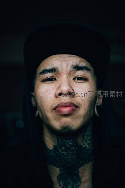 一位戴着黑色帽子、颈部有复杂纹身的青年,面部表情沉静,背景昏暗,营造出强烈的个性与街头文化氛围。