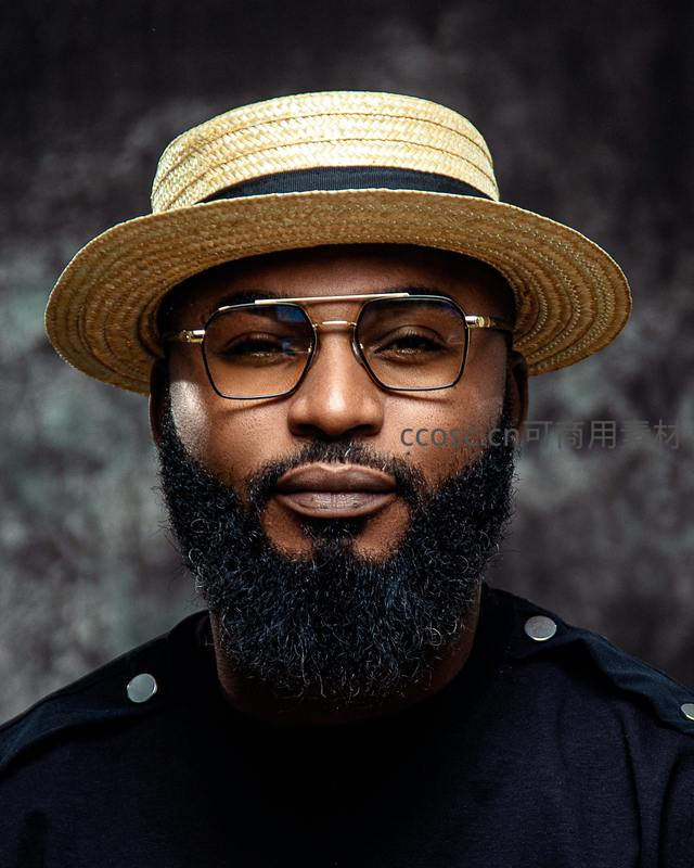 一位蓄着浓密胡须的男士头戴编织草帽,佩戴复古方框眼镜,嘴角带着自信的微笑,展现出优雅与从容并存的独特魅力。