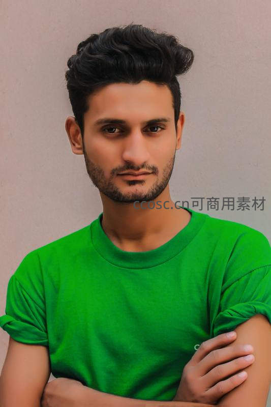 身着鲜亮绿色T恤的青年双臂交叉于胸前,眼神坚定地望向镜头,简洁的纯色背景突显其青春活力与自信洒脱的气质。
