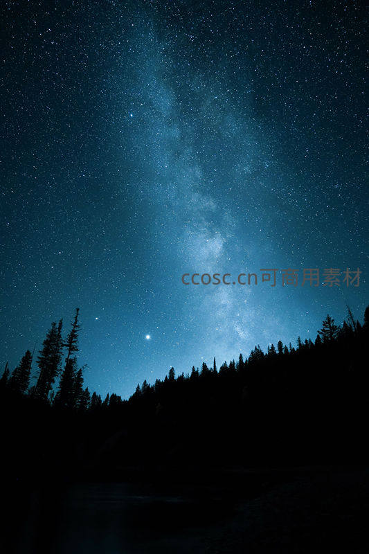 茂密森林的黑色剪影衬托着璀璨银河,深蓝色的夜空布满星辰,营造出一种庄严、神秘又令人敬畏的自然之美。