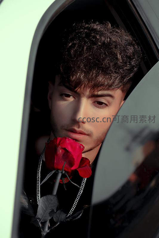 一位卷发少年从车窗探出身,手中紧握一朵鲜艳红玫瑰,眼神温柔而迷离,链条项链增添一丝不羁,营造出浪漫又神秘的氛围。