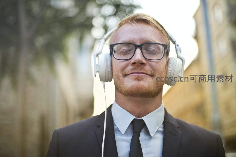 一位穿着西装、戴着眼镜的男士,在城市街道上戴着白色头戴式耳机,闭目微笑,沉浸在音乐的世界中。阳光洒在他的脸上,营造出宁静放松的氛围。
